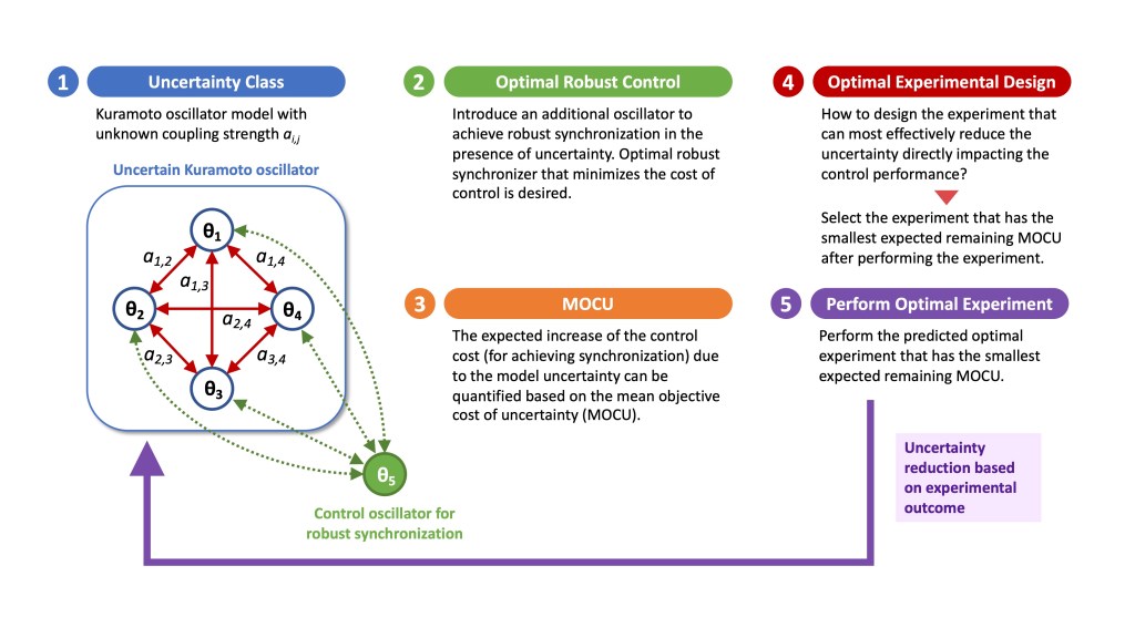 The proposed OED strategy quantifies the objective uncertainty of the Kuramoto model based on the mean objective cost of uncertainty (MOCU), where the optimal experiment can be identified by predicting the best experiment in the design space that is expected to maximally reduce the MOCU.